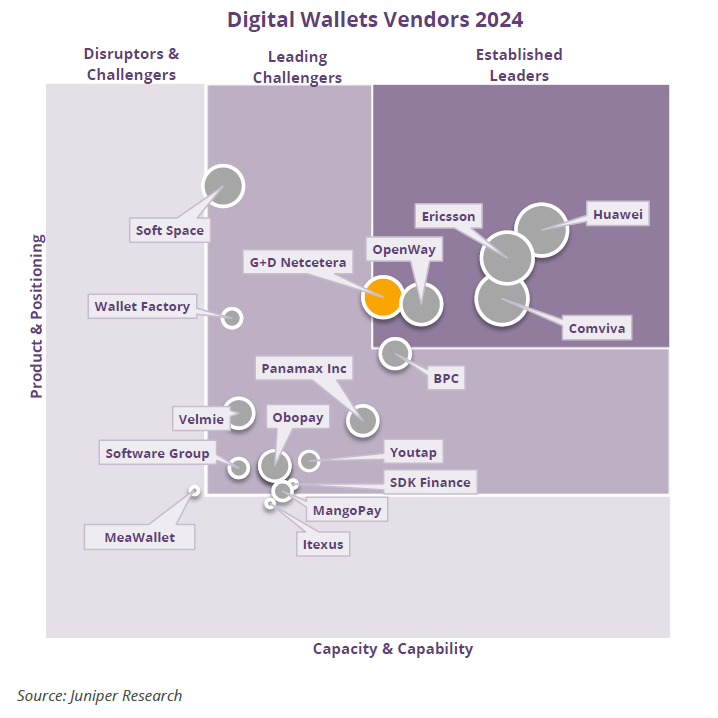 The Juniper Competitor Leaderboard names G+D Netcetera as an established market leader in the Digital Wallet vendor landscape for the second time in a row with extensive experience in the financial sector and a strong market presence in the DACH region. G+D Netcetera was also spotlighted for its strength in partnerships with several major international brands, its efforts in acquisitions, its creativity & innovation, and its high potential in future business prospects.